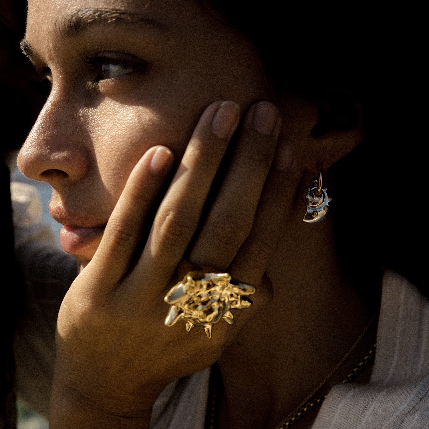 Our gold vermeil pieces are made of solid recycled sterling silver, plated with 18ct yellow gold. Gold vermeil offers the luxurious look of gold at a more affordable price. Consult our care guide on how to look after your gold vermeil piece.
