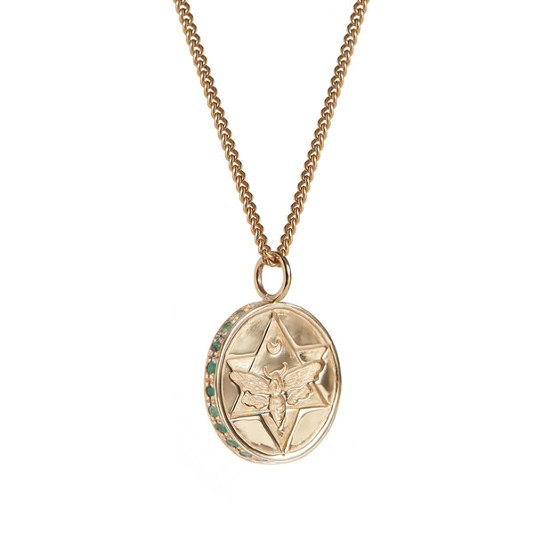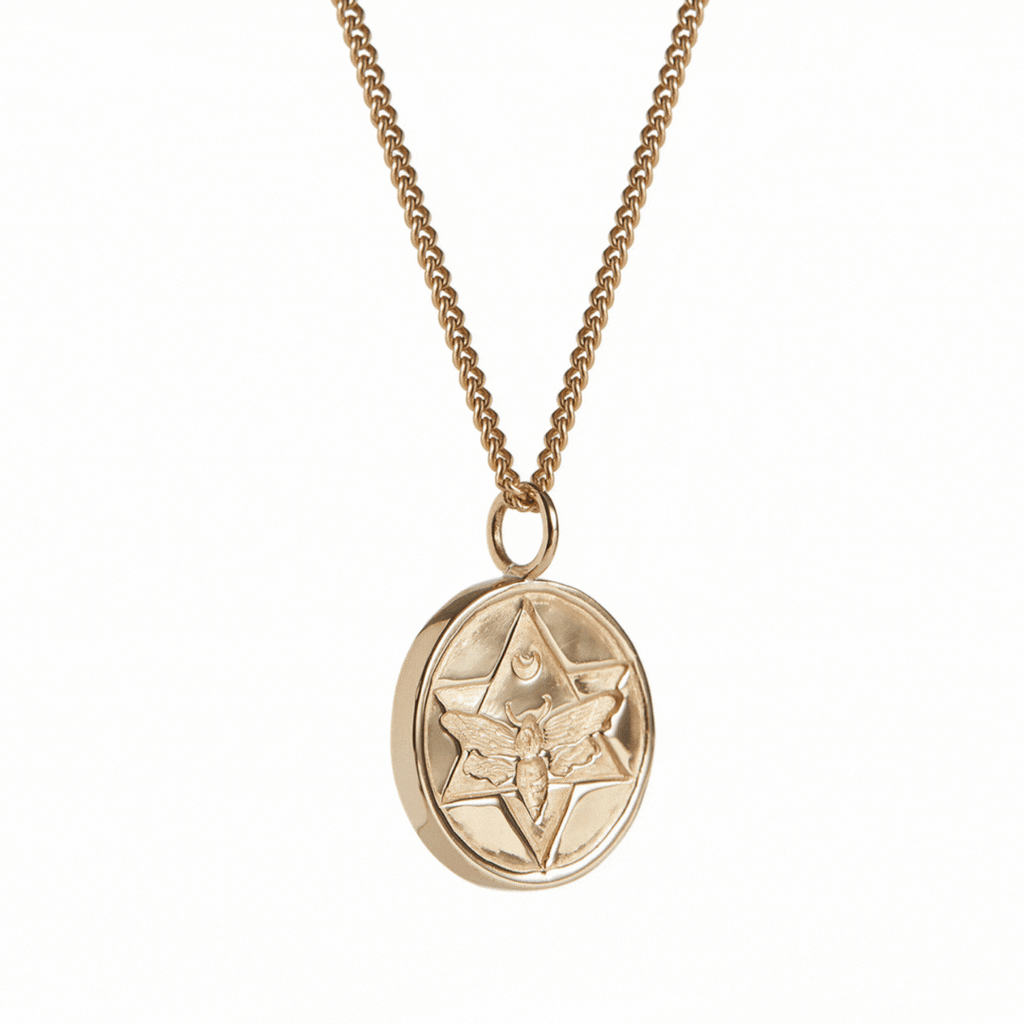 Hand engraved with a moon and moth symbol- the moth is associated with nighttime and can find light in the darkness, making it a symbol of intuition and the dualistic Yin Yang cycle of light and dark.