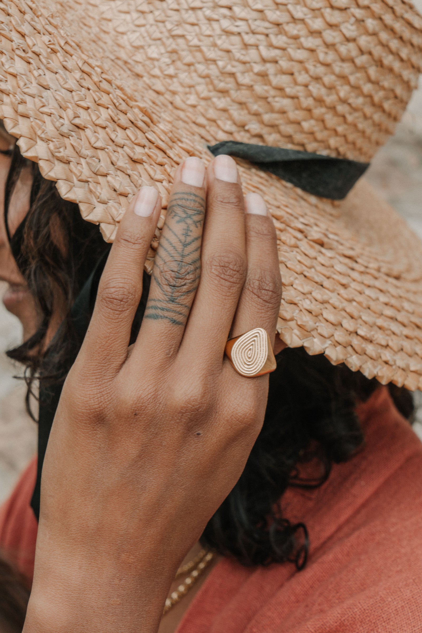 “As a city girl with a country girl heart, the Terra Collection and its nod to the earth was born from my coastal adventures from Ibiza to Norfolk. Inspired by the textures of wind- and sea-shaped rocks and whirlpools, I hand carved each design in wax to be tactile and asymmetrical, akin to natural stones or sea glass.” Rachel