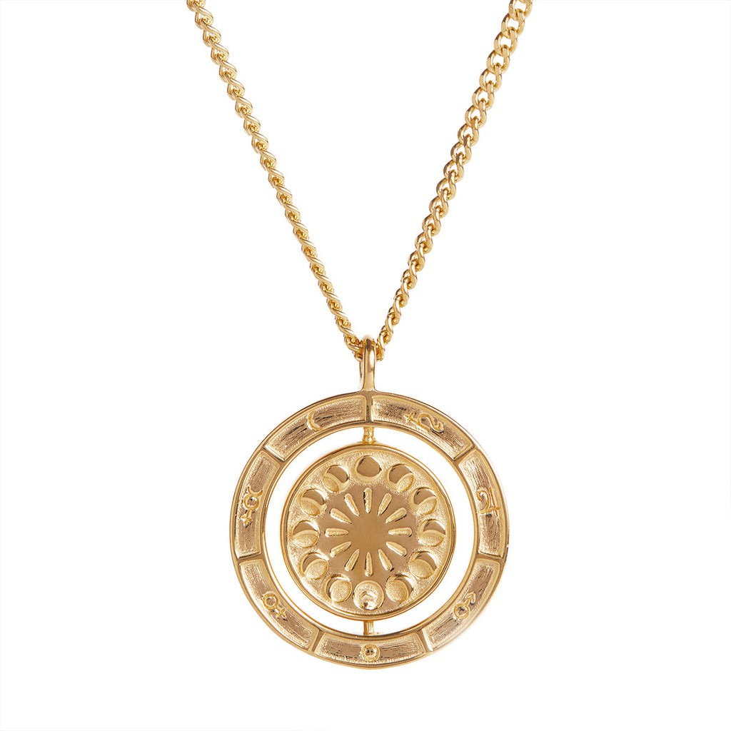 The celestial dance of the planets is elegantly captured in the circular rotation of this pendant, adorned with meticulously hand-engraved symbols. With its beautiful kinetic movement, this pendant offers a unique expression of your individual style.